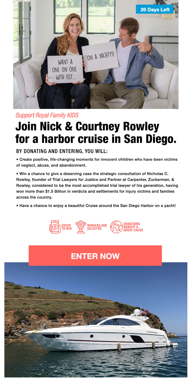 <p>By donating and entering, you will:<br />- Create positive, life-changing moments for innocent children who have been victims of neglect, aduse, and abandonment.<br />- Win a chance to give a deserving case the strategic consultation of Nicholas C. Rowley, founder of trial Lawyers of Justice and Parter at Carpenter, Zuckerman, & Rowley, consider to be the most accomplished trial lawyer of his generation, having won more than $1.5 Billion in verdicts and settlements for injury victims and families across the country.<br />- Have a chance to enjoy a beautiful Cruise around the San Diego Harbor on a yacht!</p>