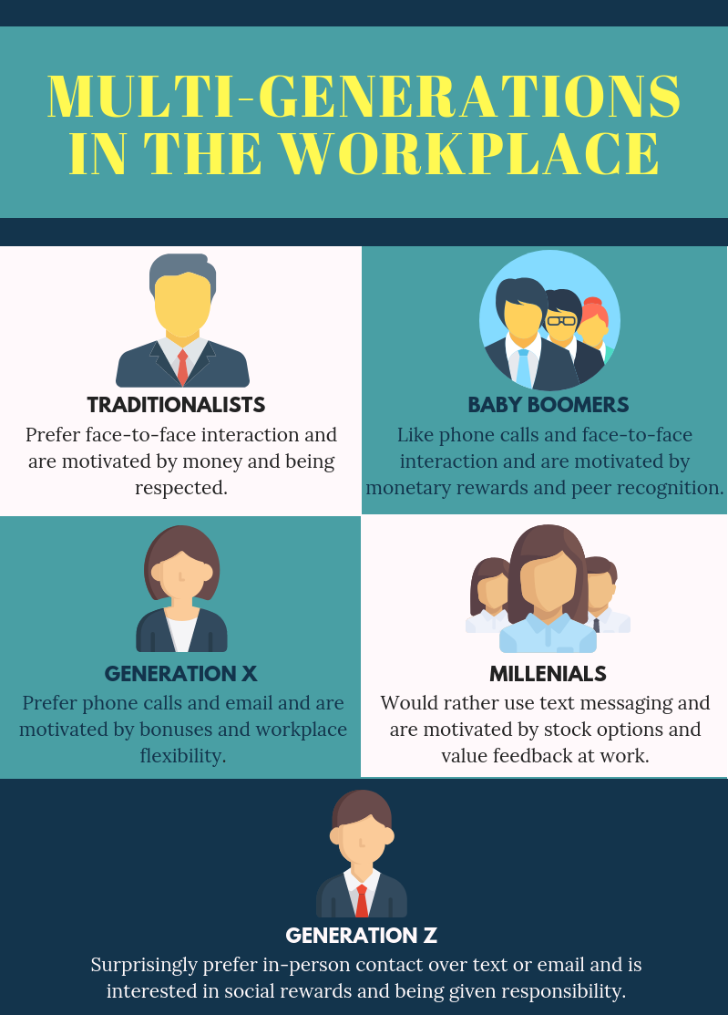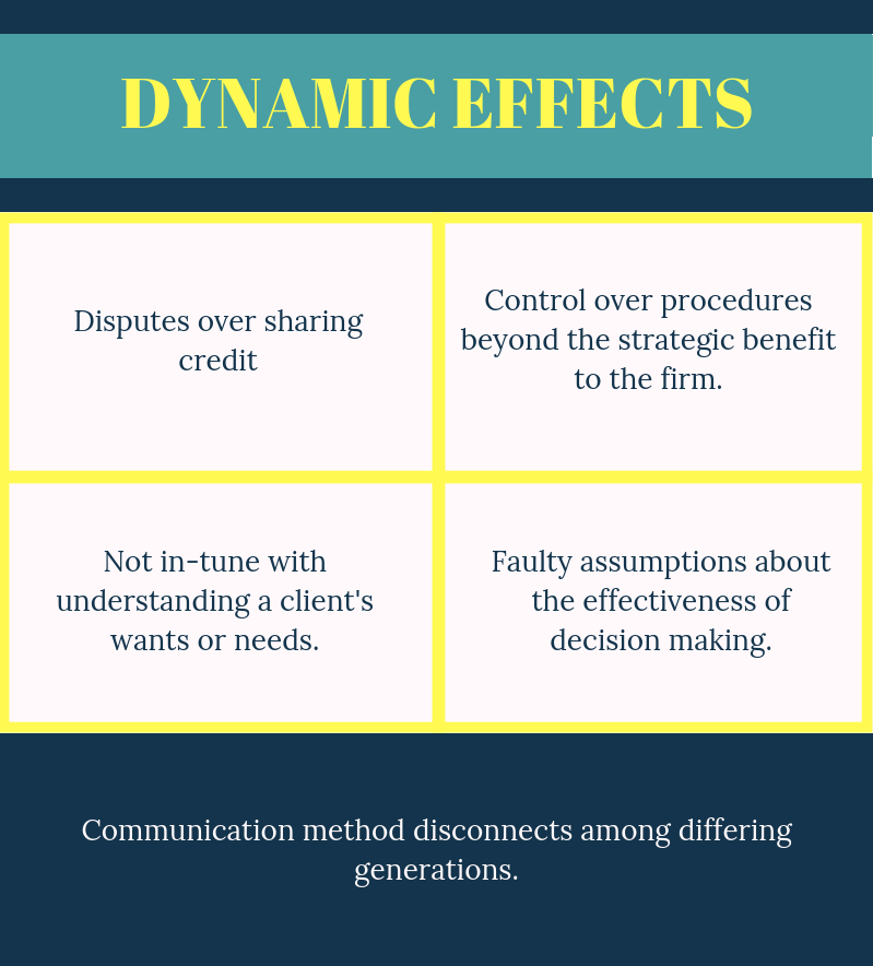 Disputes or refusal to share credit with colleagues for lead generation and bringing in new clients may arise. You may find seniority employees are controlling over procedures from the younger generation employees beyond the strategic benefit to the firm. Due to the different dynamics, opposing generations are often not in-tune with a client's wants or needs. Faulty assumptions may also be made about the effectiveness of decision making between older and younger generations. Lastly, you may find that your employees prefer various preferences involving how they best communicate.